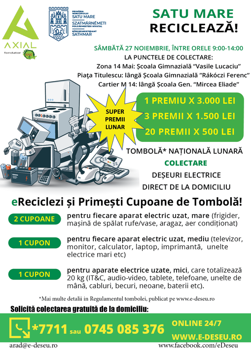 "Continuăm acțiunile lunare de colectare a deșeurilor electrice și electronice. Sâmbătă, 27 noiembrie, între orele 9.00-14.00, sătmărenii sunt așteptați la punctele de colectare amenajate pentru a scăpa în mod corect și gratuit de aceste deșeuri care pot polua mediul înconjurător", precizează Primăria Municipiului Satu Mare.