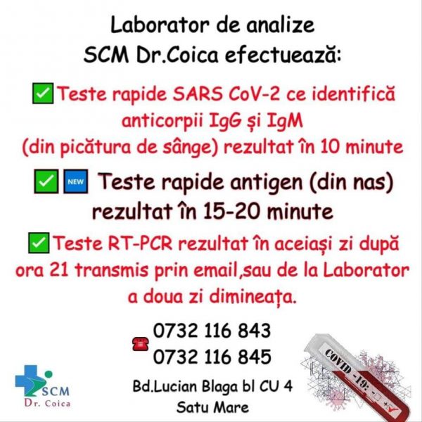 Cabinetele SCM Dr. Coica oferă sătmărenilor, pe lângă testele rapide și cele de tip RT-PCR, și teste antigen. Rezultatul testelor antigen este disponibil în 15-20 de minute, spun reprezentanții companiei, care precizează și faptul că pacienții vor putea, pe baza rezultatelor, să obțină concediul medical necesar pentru a acoperi perioada de izolare la domiciliu.
