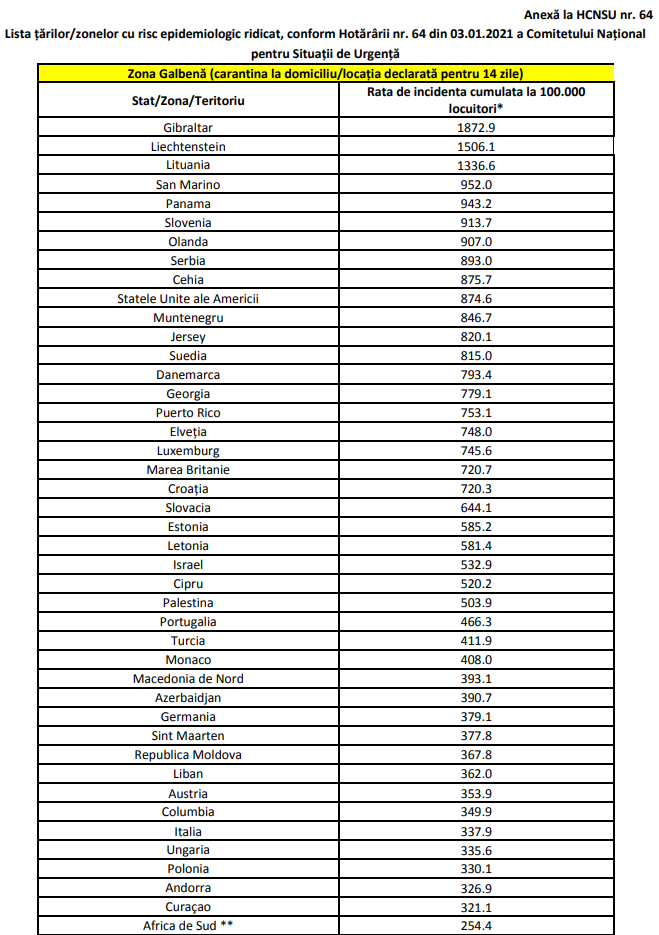 Comitetul Național pentru Situații de Urgență (CNSU) a adoptat în ședința de astăzi, 3 ianuarie 2021, Hotărârea privind aprobarea listei țărilor cu risc epidemiologic pentru care se instituie măsura carantinei asupra persoanelor care sosesc în România din acestea.