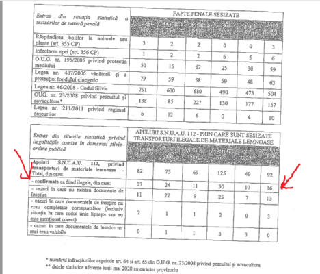 Numărul transporturilor ilegale de lemn descoperite în urma apelurilor la 112, în lunile martie-mai 2020, a fost dublu față de aceeași perioadă a anului 2019, spune senatorul USR Miahi Goțiu pe pagina sa de socializare prezentând datele primite de la ministerul de Interne, în urma unei interpelări. Potrivit tabelului prezentat, în luna aprilie, unul din patru transporturi de lemn verificate în urma apelurilor la 112 a fost ilegal, după ce, în luna martie, unul din trei transporturi verificate a fost ilegal.