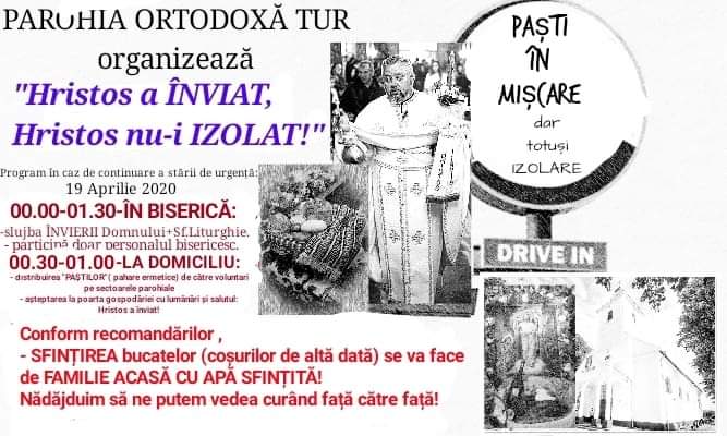 Un mesaj postat pe pagina de socializare a Parohiei Tur arată cum unii prelați au găsit soluții inedite pentru a păstra tradițiile creștine sub starea de urgență care a închis lăcașele de cult. Sub egida "SOLUȚIE DE CRIZĂ la timp de criză"-proiectul parohial ,, Paști în mișcare",, "Hristos a ÎNVIAT, Hristos nu-i IZOLAT", preotul le explică enoriașilor condițiile speciale în care vor fi celebrate sărbătorile pascale.
