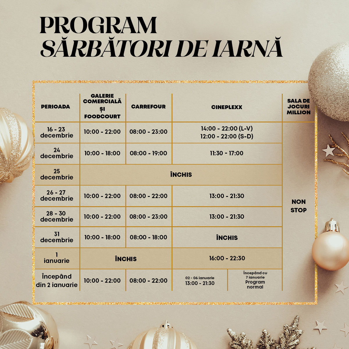 Shopping City Satu Mare a publicat programul de sărbători. Galeriile comerciale, dar și magazinul Carrefour vor funcționa după un orar special.