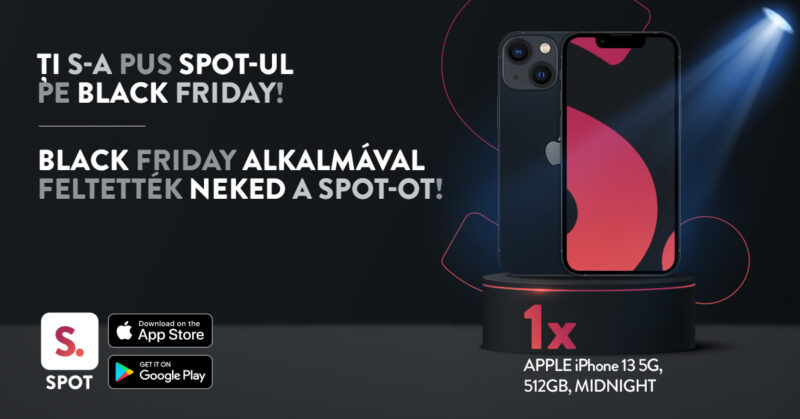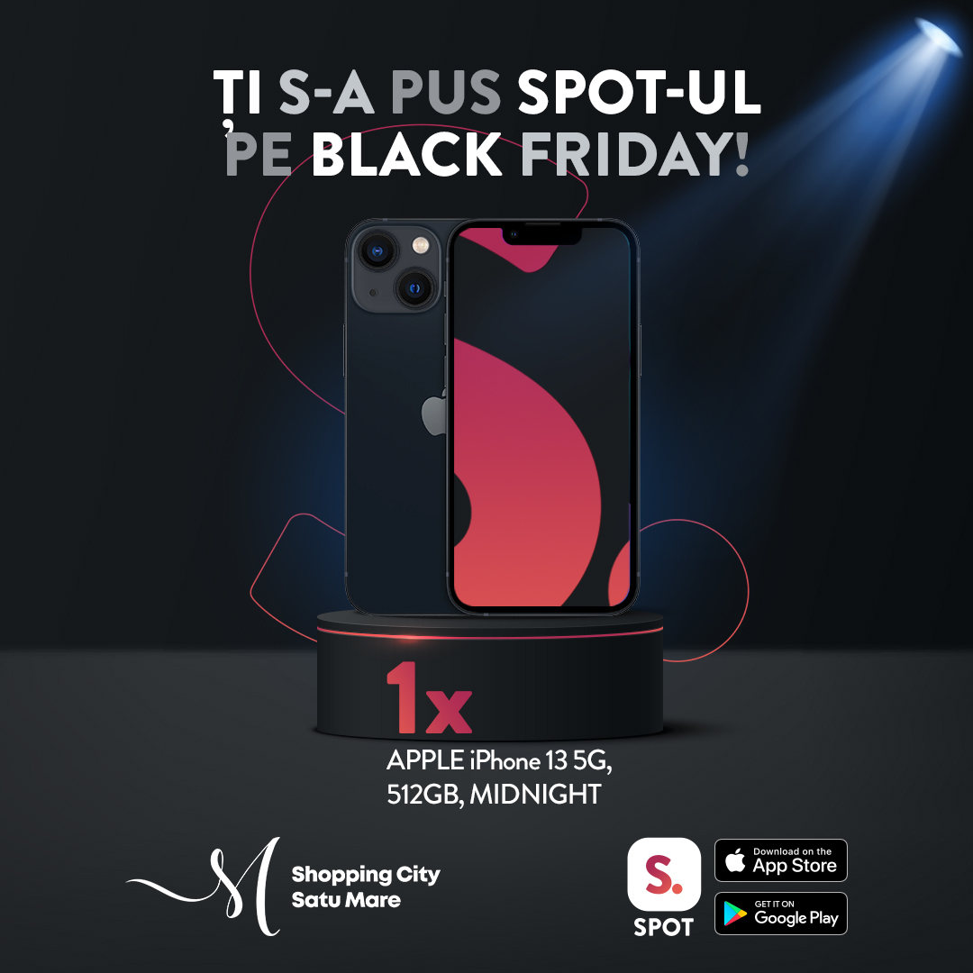 Sub conceptul „Ți s-a pus SPOT-ul pe Black Friday”, campania se va desfășura de vineri, 12 noiembrie, până duminică, 28 noiembrie. Pe lângă reducerile importante din magazinele partenere, utilizatorii aplicației SPOT beneficiază în weekendul 12 – 14 noiembrie de 10% discount la achiziția de carduri cadou Shopping City Satu Mare, 50% extra puncte în aplicație, iar pe baza bonurilor de cumpărături scanate în aplicație, în perioada 12-28 noiembrie, vor intra automat în tragerea la sorți pentru un Iphone 13 5G, 512GB, Midnight.