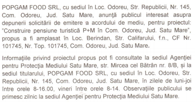 Solicitare acord de mediu ”Construire pensiune turistică P+M, Odoreu”