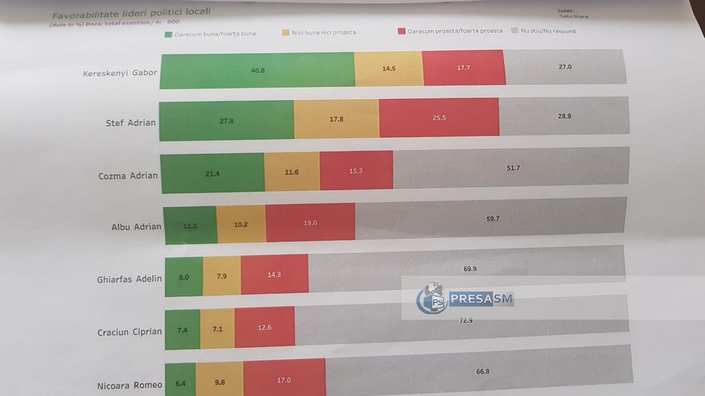 Sondajul a fost efectuat în decembrie 2018 și arată că actualul primar al municipiului Satu Mare, Kereskenyi Gabor, conduce detașat topul celor mai apreciați politicieni din Satu Mare. 40,8% dintre respondenți au răspuns că au o părere oarecum bună/foarte bună și numai 17,7% au spus că au o părere proastă.