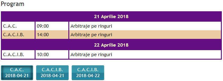 Sâmbătă sunt programate competiţiile CAC (Certificatul de Aptitudini din Campionat) şi CACIB (Certificat de Aptitudine pentru Campionatul Internaţional de Frumuseţe), iar duminică CACIB.