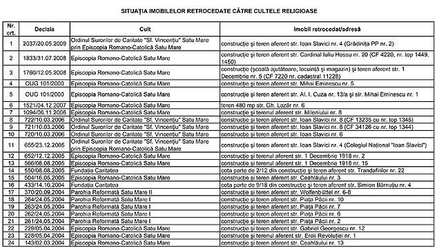 Statul român, prin instituțiile abilitate, au pregătit un plan timid (care depinde de factorul politic, format din lipitori de afișe plantați în posturi cheie și baronii locali care i-au promovat din PNL, ALDE sau PSD) pentru a scăpa de chiriile plătite lunar de Primăria Satu Mare către Episcopia Romano-Catolică pentru clădirile retrocedate, în care funcționează unități de învățământ. Este vorba despre mai multe imobile, printre care Grădiniţa Ham Janos, Liceul Ham Janos, Colegiul Naţional Kolcsey Ferenc, Colegiul Naţional Ioan Slavici, Grădiniţa nr.2.