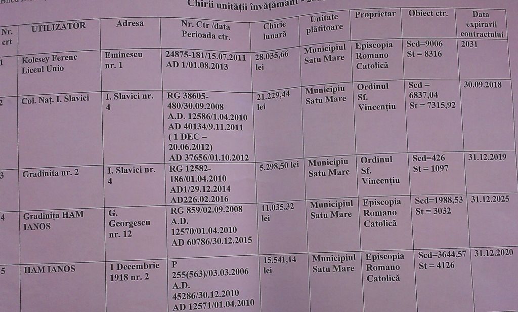 Concret, contractul pentru imobilul în care funcţionează Liceului Kolcsey Ferenc expiră în anul 2031, pentru Liceul Ham Janos – 2020, iar pentru Grădinița Ham Jonos – 2025. La polul opus, contractul pentru Colegiul Național ”Ioan Slavici” termenul expiră în data de 30.09.2018.