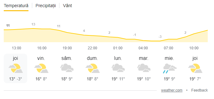 În weekend vremea va fi frumoasă, cu un cer variabil și maxime de 18 grade Celsius, în timp ce minimele se vor situa tot în jurul valorii de 8, chiar 9 grade Celsius.