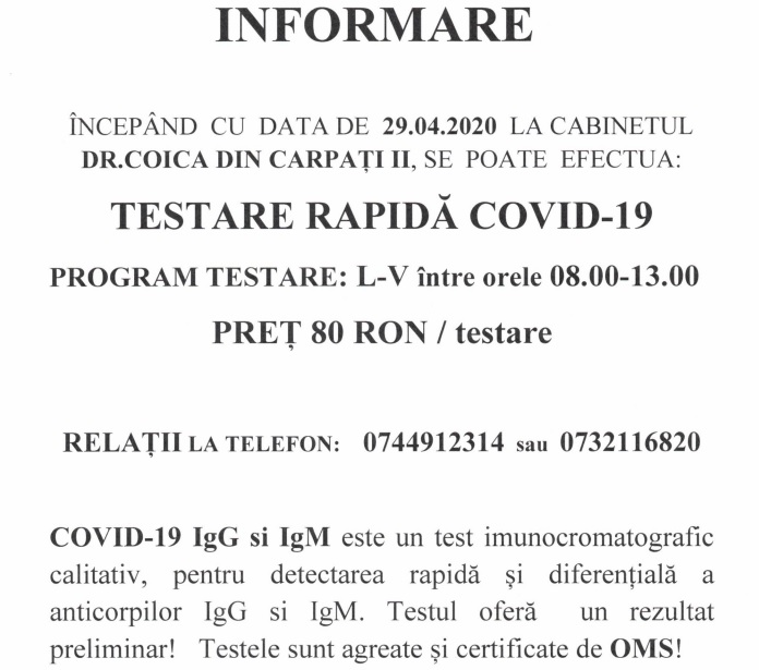 Începând cu data de 29 aprilie, la Cabinetele Dr. Coica, situate în cartierul Carpați II, se poate efectua testarea rapidă Covid-19. Prețul unui test este de doar 80 lei. Relații la telefon: 0744.912....