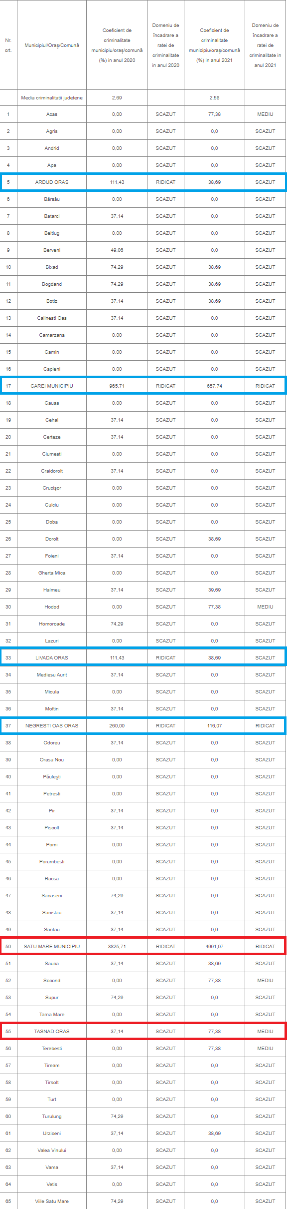 O scădere mare a coeficientului de criminalitate este înregistrată în orașul Livada, de la 111 în 2020 (RIDICAT) la 38 în 2021 (SCĂZUT).
