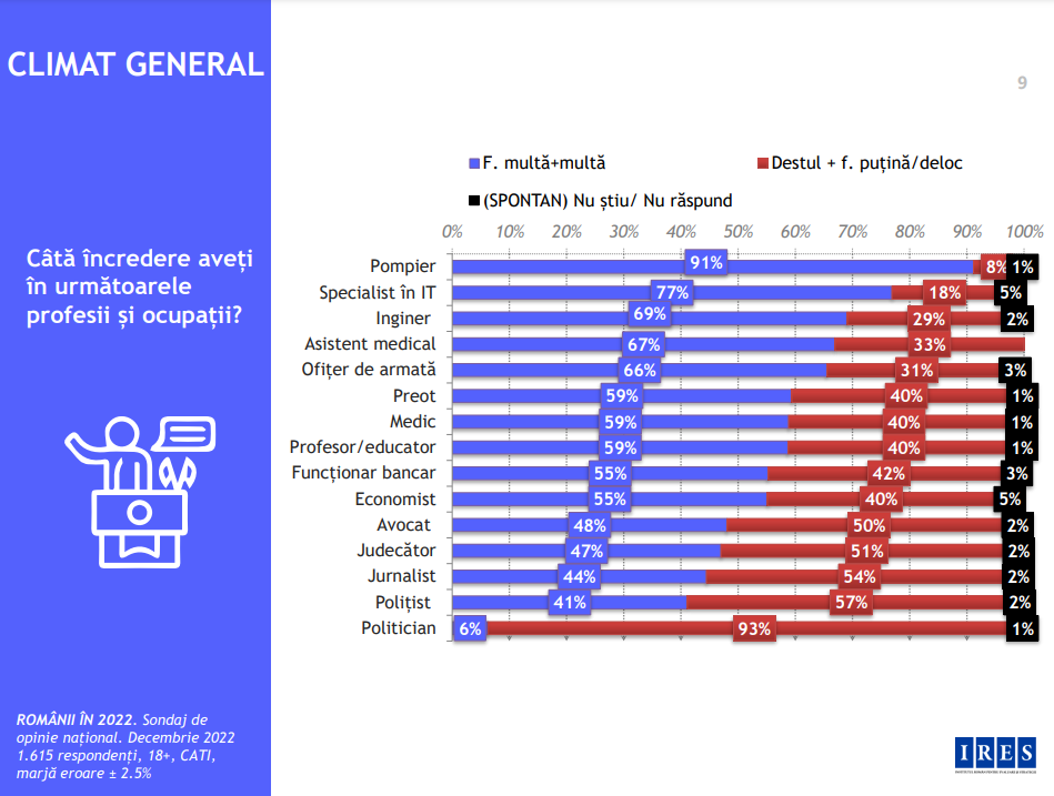 Pompierii conduc detașat topul încrederii în 2022, arată un sondaj difuzat de Institutul Român pentru Evaluare și Strategie (IRES). Sondajul a fost realizat între 7 și 12 decembrie 2022, pe un eșantion de 1.615 persoane cu vârsta de 18 ani și peste.