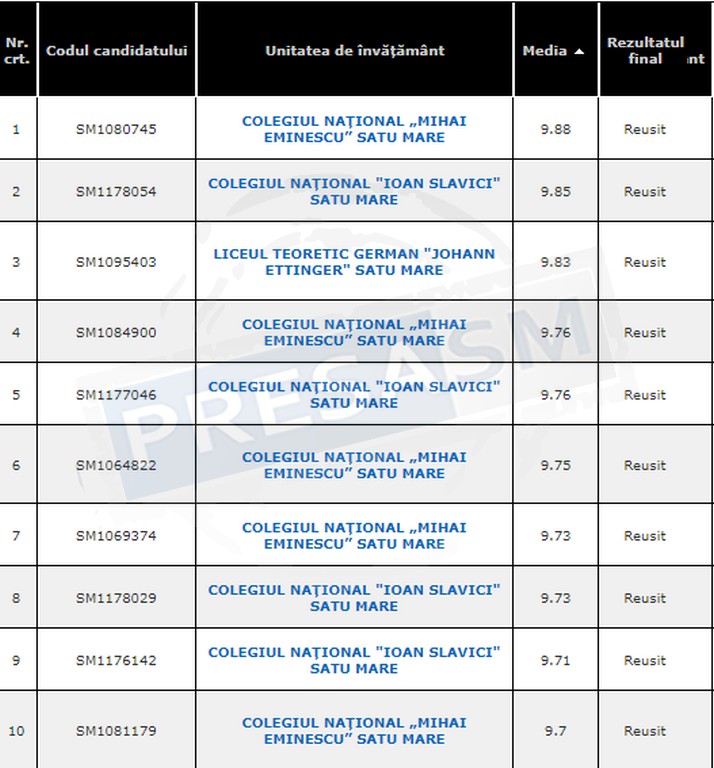 Cea mai mare medie aparține unui elev de la Colegiul Național ”Mihai Eminescu” din municipiul Satu Mare, respectiv 9,88. Pe locul secund s-a clasat un elev de la Colegiul Național ”Ioan Slavici” Satu Mare, cu o medie de 9,85, iar pe poziția a treia este un elev de la Liceul Teoretic German ”Johann Ettinger” Satu Mare, cu media 9,83.