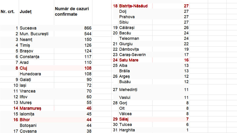 În regiunea de nord-vest a țării, doar județul Sălaj a înregistrat cazuri mai puține, un total de șapte cazuri. Datele prezentate pe județe de Grupul de Comunicare Strategică prezintă doar un tablou parțial în ceea ce privește evoluția epidemiei de COVID-19 în România. Nu sunt furnizate date cu privire la procentul de populație testată, iar în primele săptămâni, doar câteva centre din țară realizau prelucrarea probelor care veneau din toate celelalte județe ale țării.