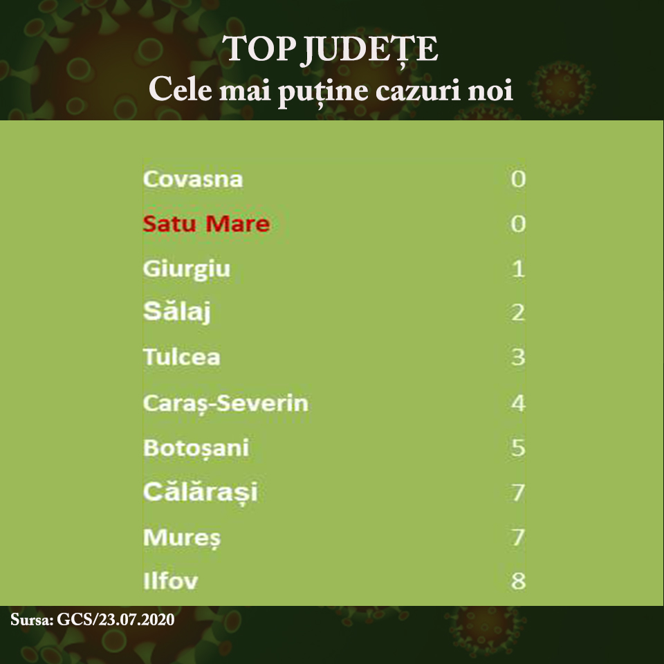 Satu Mare și Covasna sunt cele două județe din țară care nu au mai raportat cazuri noi în ziua în care România înregistrează un nou record de cazuri în ultimele 24 de ore. Pe lista județelor cu cazuri puține figurează și Giurgiu, care a raportat un singur caz nou, în timp ce vecinii din Sălaj au identificat două noi cazuri. Tulcea, Caraș-Severin și Botoșani completează topul județelor cu puține noi cazuri.
