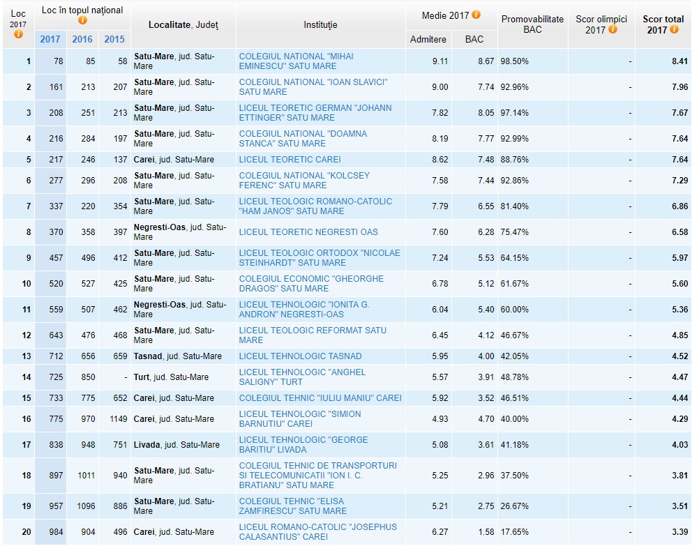 Doar un singur liceu din județul Satu Mare se află în TOP 100 național, potrivit datelor Ministerului Educației din anul 2017. Cu toate acestea, situația s-a îmbunătățit față de anul 2016, majoritatea liceelor înregistrând o clasare mult mai bună. Doar Colegiul Naţional ”Mihai Eminescu” Satu Mare se află în TOP 100 la nivel național. Mai exact, se situează pe locul 78. Al doilea este Colegiul Naţional ”Ioan Slavici” Satu Mare, care ocupă locul 161 la nivel național. ”Podiumul” este completat de către Liceul Teoretic German ”Johann Ettinger Satu Mare”, care ocupă poziția 208 la nivel național. Următoarele licee sunt: Locul 216 - Colegiul Naţional ”Doamna Stanca” Satu Mare Locul 217 - Liceul Teoretic Carei Locul 277 - Colegiul Naţional ”Kolcsey Ferenc” Satu Mare Locul 337 - Liceul Teologic Romano Catolic ”Ham Janos” Satu Mare Locul 370 - Liceul Teoretic Negrești-Oaș Locul 457 - Liceul Teologic Ortodox ”Nicolae Steinhardt” Satu Mare Topul a fost alcătuit de cei de la situl admitereliceu.ro, în funcție de mai multe criterii, printre care media de admitere în liceu (50%), media la examenul de bacalaureat (40%) și rezultatele obținute la olimpiade (10%).