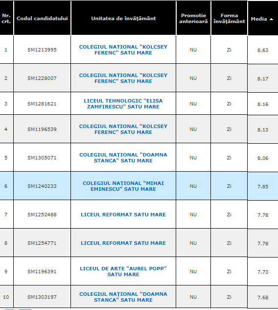 În TOP 3 cele mai mari medii la sesiunea din toamnă, unitatea de învățământ cu cei mai buni elevi a fost Colegiul Național ”Kolcsey Ferenc” Satu Mare. Un elev a luat media 8,63, iar al doilea a obținut 8,17. Pe locul al treilea s-a clasat un elev al Liceului Tehnologic ”Elisa Zamfirescu”, cu media 8,16.