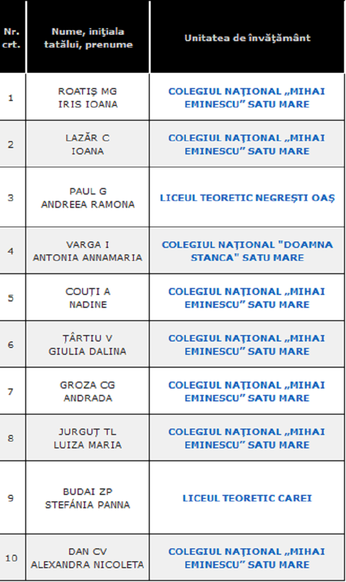 Pe locul secund s-a clasat Ioana Lazăr, tot de la Colegiul Național ”Mihai Eminescu”, cu media 9,93. Media 9,93 a mai fost obținută de alți doi elevi, respectiv Ramona Andreea Paul, de la Liceul Teoretic Negrești-Oaș, și Antonia Annamaria Varga, de la Colegiul Național ”Doamna Stanca” din municipiul Satu Mare.