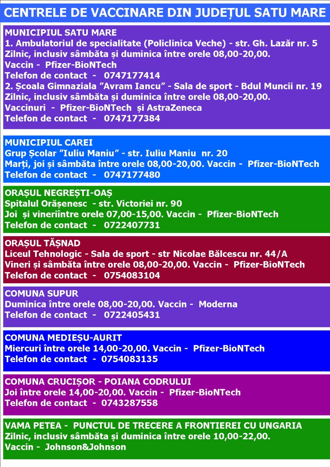 Față de lunile anterioare, se obervă o scădere a interesului față de vaccinare, ceea ce a dus în mai multe zone la comasarea unor centre. La fel s-a întâmplat și la Satu Mare, iar în cursul săptămânii, Instituția Prefectului a publicat o nouă listă cu centrele de vaccinare disponibile la nivelul județului.