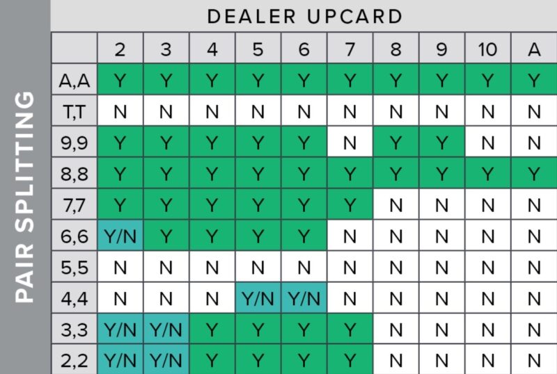 Trebuie să mai știți că există o mână pe care ar fi bine să nu o splitați. Dacă aveți o pereche de 10, păstrați mâna așa. Motivul este cât se poate de simplu: aveți o mână ideală având un total de 20. Șansele sunt în favoarea ta, indiferent de mâna dealerului.