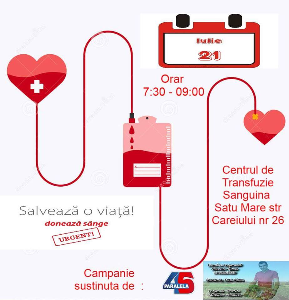 Astfel, vineri, 21 iulie, între orele 7:30 -9:00 sunteți aşteptați la Centrul de Transfuzie Sanguină Satu Mare pentru a "dărui o picătură din miracolul vieții unui OM". Un grup de tineri a căror motto este "Mână de la mână, pentru un trai mai bun" vă provoacă să vă prezentați pentru a dona sânge.