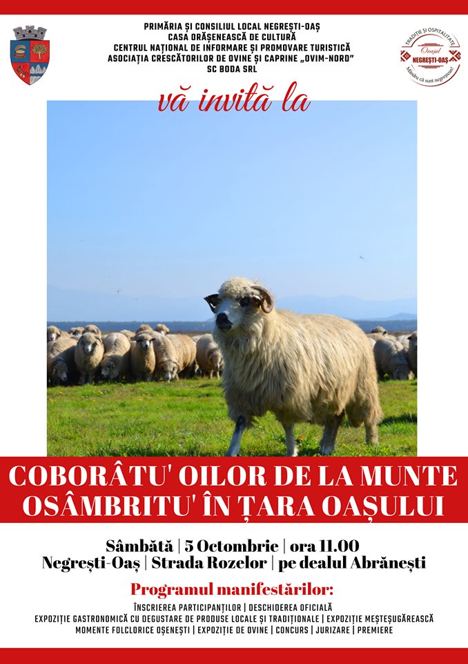 Primăria și Consiliul Local al Orașului Negrești-Oaș, prin Casa Orășenească de Cultură, organizează sâmbătă, 5 octombrie 2019, a III-a ediție a evenimentului ”Coborâtu’ oilor de la munte – Osâmbritu’ în Ţara Oaşului”. Evenimentul tradițional se va desfășura începând cu ora 11, pe strada Rozelor (Dâmbu’ lui Haşca), la locul numit Abrăneşti.