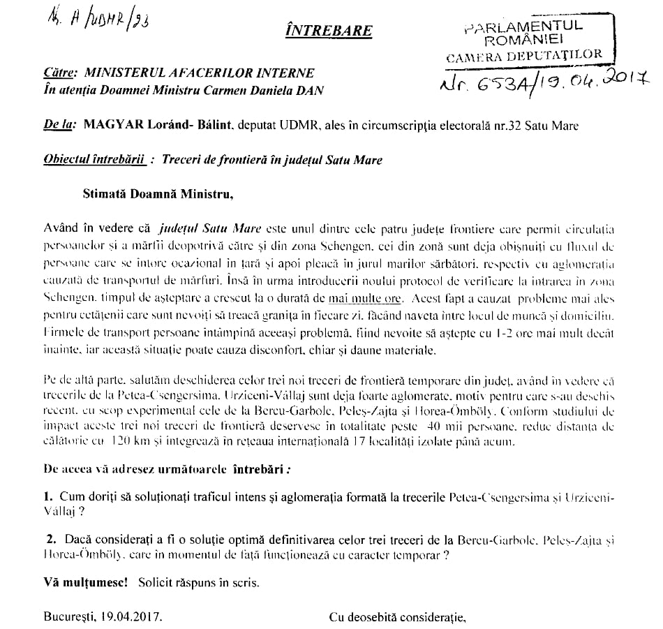 ”Se împlinesc 4 ani de când am început demersurile pentru deschiderea punctelor de trecere a frontierei de la Bercu, Horea și Peleș. Deși există acordul Ministerului de Externe din Ungaria, autoritățile române au tot amânat, iar singurul răspuns pe care l-am primit a fost că ”nu are rost, intrăm în Schengen”.