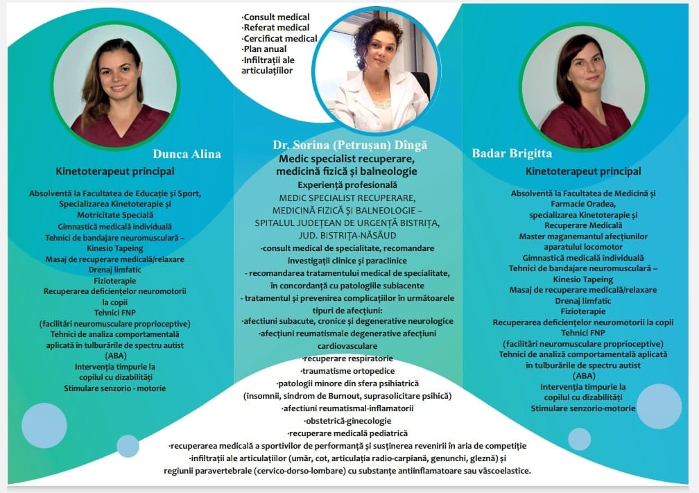 Cabinetul de reabilitare Noa, situat pe strada Alexiu Berinde nr. 15 în municipiul Satu Mare, vine tocmai în sprijinul acestor pacienți, pentru a îmbunătăți calitatea vieții și a găsit acele eficiente tratamente. Specialistul clinicii de reabilitare, care a lucrat și la Spitalul Județean de Urgență Bistrița-Năsăud este dr. Sorina (Petrușan) Dîngă, iar Alina Dunca și Brigitta Badar în calitate de kinetoterapeuți principali se asigură că terapiile vor avea un impact pozitiv.