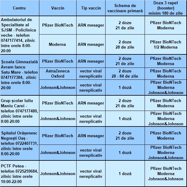 Vaccinul monodoză de la Johnson&Johnson, care a fost cel mai solicitat în ultima perioadă, este în acest moment disponibil în următoarele centre de vaccinare: centrul Avram Iancu din municipiul Satu Mare, în Carei și la Negrești-Oaș.