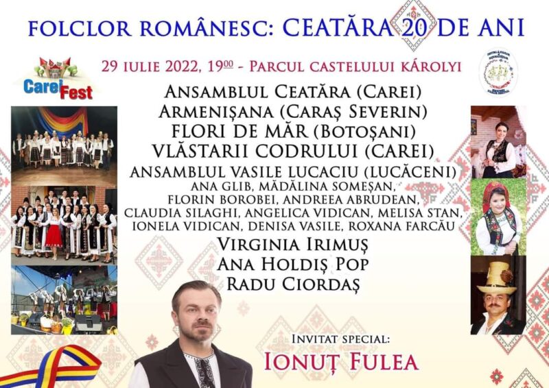 Participă: Ansamblurile Ceatăra (Carei), Armenișana (Caraș Severin), Flori de măr (Botoșani), Ansamblul Vasile Lucaciu (Lucăceni), Vlăstarii Codrului (Carei), Ana Glib, Mădălina Someșan, Florin Borobei, Andreea Abrudean, Claudia Silaghi, Angelica Vidican, Ionela Vidican, Denisa Vasile, Roxana Farcău, Melisa Stan, Virginia Irimuș, Ana Holdiș Pop, Radu Ciordaș. Invitat special: Ionuț Fulea.
