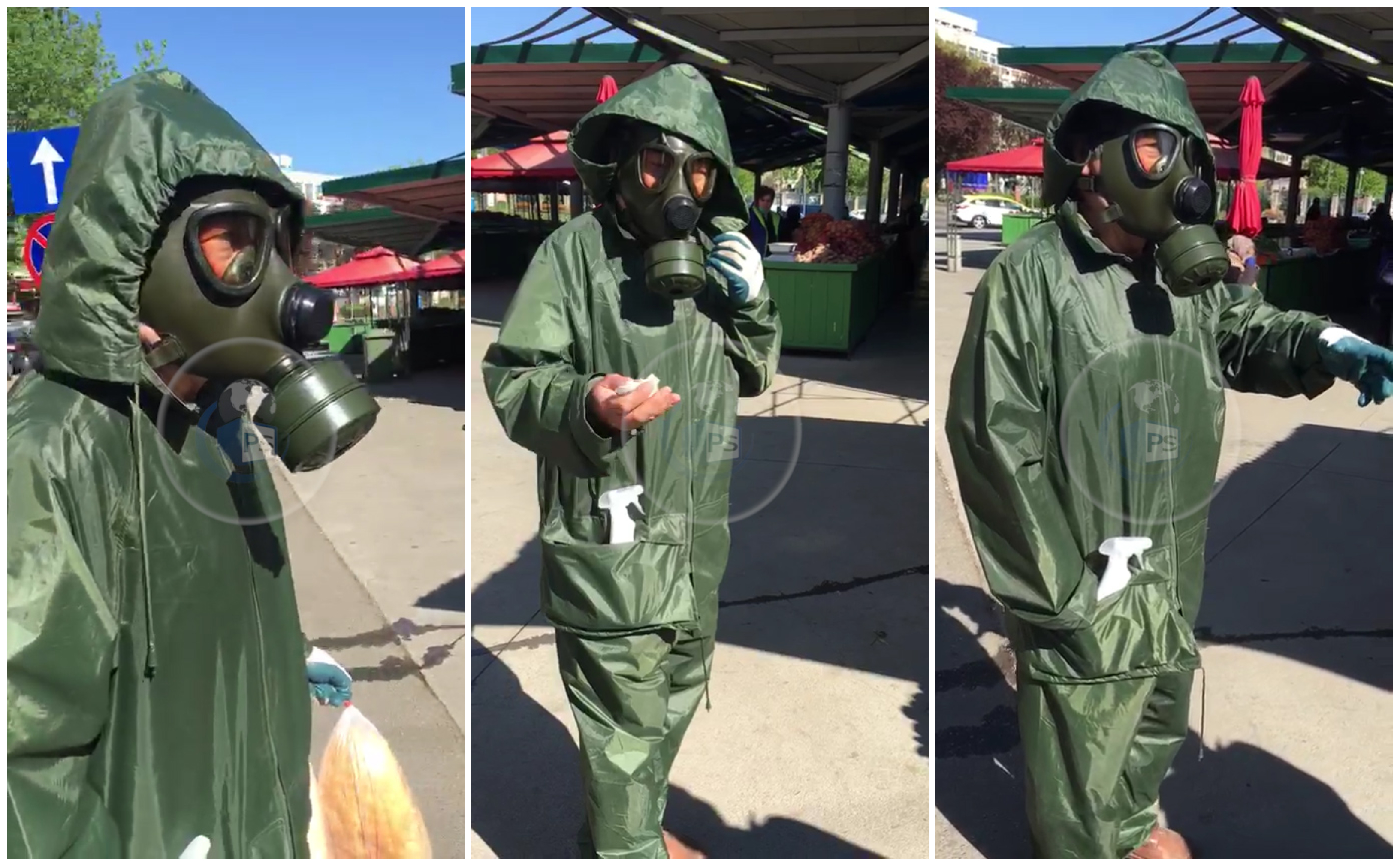 Un sătmărean, în vârstă de circa 50 de ani, a ales să își ia toate măsurile de protecție în fața noului coronavirus. Acesta a mers astăzi în Piața Someș din municipiul Satu Mare pentru a-și cumpăra alimente, dar a fost surprins de numărul mare de persoane care nu foloseau mijloace de protecție.