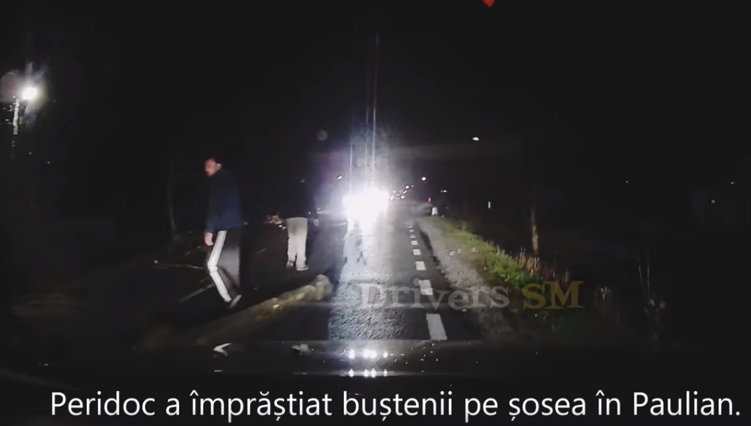 Traficul rutier a fost blocat total, buștenii fiind împrăștiați pe ambele sensuri de circulație! Mai multe persoane au încercat să debaraseze de urgență șoseaua, activitatea care a necesitat un timp mai îndelungat.