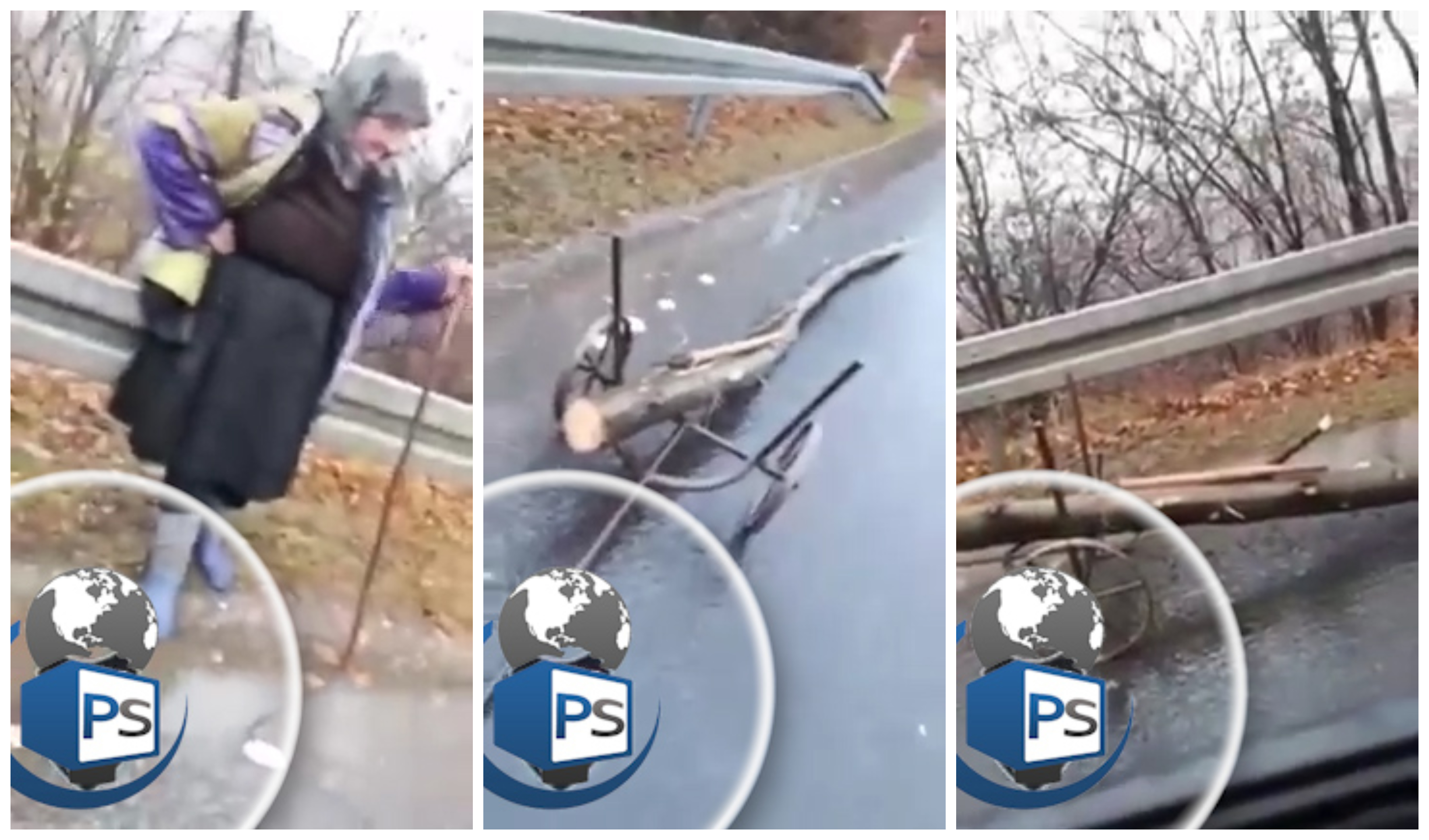 Pentru a avea lemne de foc pentru iarnă, o bătrânică (80 de ani) cară în fiecare zi, cu ajutorul unui cărucior, plin ploaie și prin frig, câte un buștean (lemn accidental) pe Drumul Național 18 spre casă.