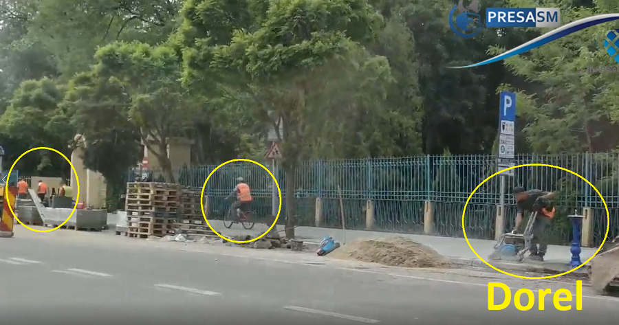 Aceiași muncitori au fost observați miercuri într-o ipostază deloc fericită pentru șefii lor. Un muncitor lucra din greu, manevrând un utilaj, în timp ce alți șase stau, iar un al șaptelea se dă pe o ...bicicletă.