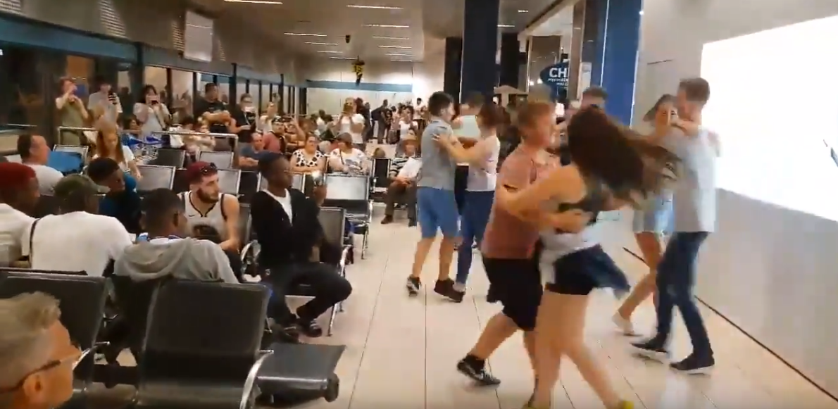 Cum au fost anunțați că zborul spre Larnacca va avea întârzieri, sătmărenii s-au pus să cânte și să danseze, spre încântarea publicului.