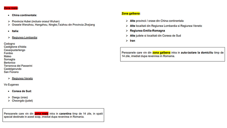 Ultima informare oficială, valabilă din data de 2 martie, arată care sunt zonele roșii și cele galbene. În plus, ministerul Afacerilor Externe a pus la dispoziția românilor plecați în străinătate un număr de telefon pentru a afla detalii cu privire la coronavirus și măsurile de siguranță luate de autorități.