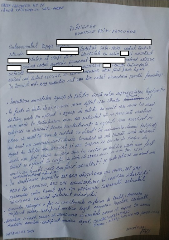 Cert este că acesta a solicitat un certificat medico-legal din care rezultă că ar fi fost bruscat. Tânărul a mai depus o plângere penală direct la Parchet împotriva polițiștilor.