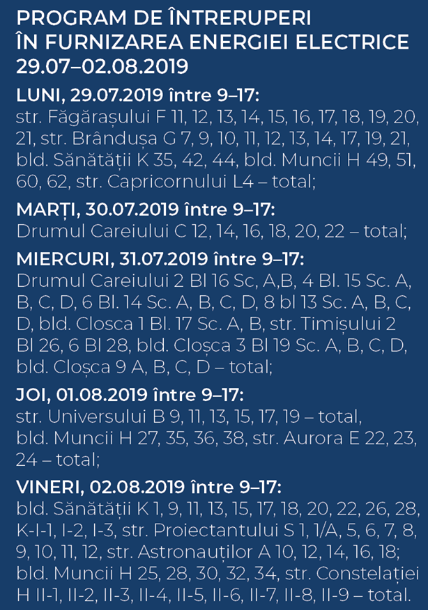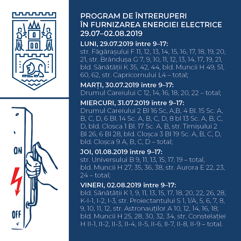 Societatea de distribuție a energiei electrice anunță întreruperi programate în alimentarea cu energie electrică în municipiul Satu Mare, după cum urmează: